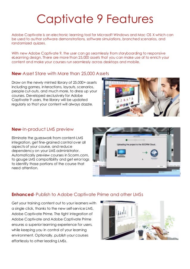 Adobe Captivate 9 (August 15) Adobe Captivate 9 adds new features including multi state objects, improved effects and motion paths, creating a content draft on an iOS device, and publishing to the new Adobe LMS known as Captivate Prime Adds the integration of eLearning Brothers Templates. Adobe Captivate 9 (64 Bit) is an application released by Adobe Systems Incorporated Some people choose to uninstall this program This is easier said than done because deleting this by hand requires some knowledge regarding PCs The best SIMPLE approach to uninstall Adobe Captivate 9 (64 Bit) is to use Advanced Uninstaller PRO. Adobe Captivate has the ability to publish online courses in multiple devices such as Desktops, iPads, and mobile devices The latest feature of Captivate 9 facilitates publishing the course as an Android/iOS app (App) The important point here is, we can publish to multiple devices and apps with just one source file.