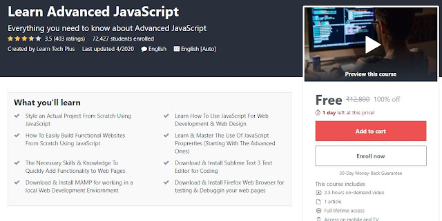 Welcome to the Javascript Awesomeness Course, where you will learn to write the basics of Javascript, the awesome way!. Learn how to make your website dynamic with Javascript!. Enrol on this Learn Advanced JavaScript paid Udemy course now free for a limited time Once enrolled, you will get to learn everything you need to know about Advanced JavaScript So, if you had plans to hone your JavaScript skills, then this course is for you.