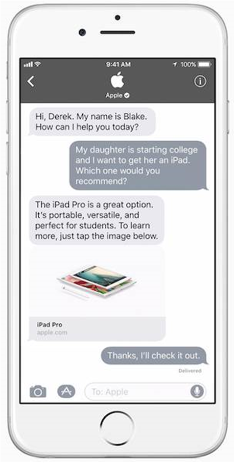 Apple Business Chat adds a new channel to Nuance Customer Service Messaging, enabling enterprises to engage with their clients in their channel of choice, whenever they want The combination of automated and humanassisted interactions makes it easier for companies to react to inquiries at any time. Apple Business Chat Interact with your customers and add more personality with rich images and video all right in Apple's messaging app Connect with your customers on iPhone, iPad, Mac and Apple Watch Get Started 60% Of 14 yearolds want to recieve SMS from business 14 B. Apple Business Chat is more than just text messaging It’s a rich user experience integrated directly into iOS with no download required Lower the barrier to initial contact and keep the conversation meaningful with oneonone interactions at the consumer’s pace.