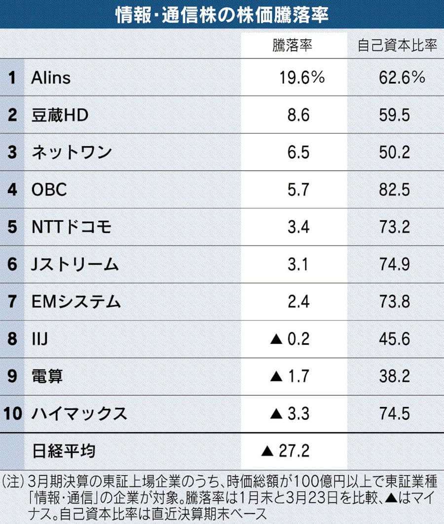 情報 通信株の株価騰落率 Aiや動画配信 上位 日本経済新聞