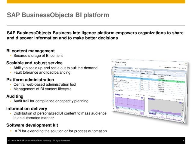 SAP BusinessObjects Business Intelligence Platform 42;. SAP BusinessObjects Business Intelligence (BI) 42 Training Learn SAP BusinessObjects BI 42 suite, an integrated platform for reporting, dashboards, visualization, and analytics Rating 40 out of 5. SAP BusinessObjects Business Intelligence (BI) platform provides flexible systems management for an enterprise BI standard that allows administrators to confidently deploy and standardize their BI implementations on a proven, scalable, and adaptive serviceoriented architecture You can find BI 42 new capabilities in the What's New in BI 42 guide.