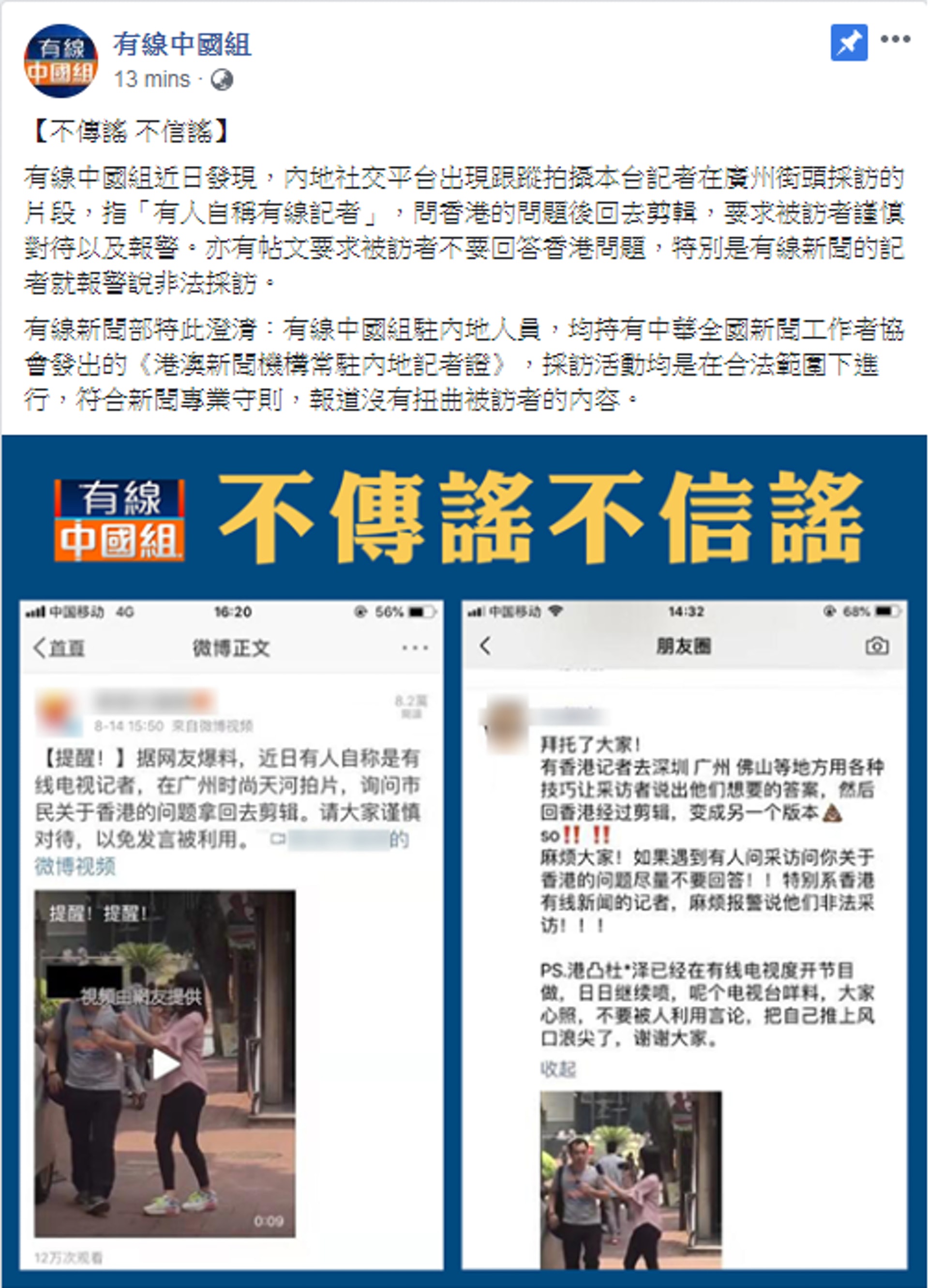 親中群組改圖屈受襲記者講 支那 有線中國組 惡意詆毀 立場報道 立場新聞