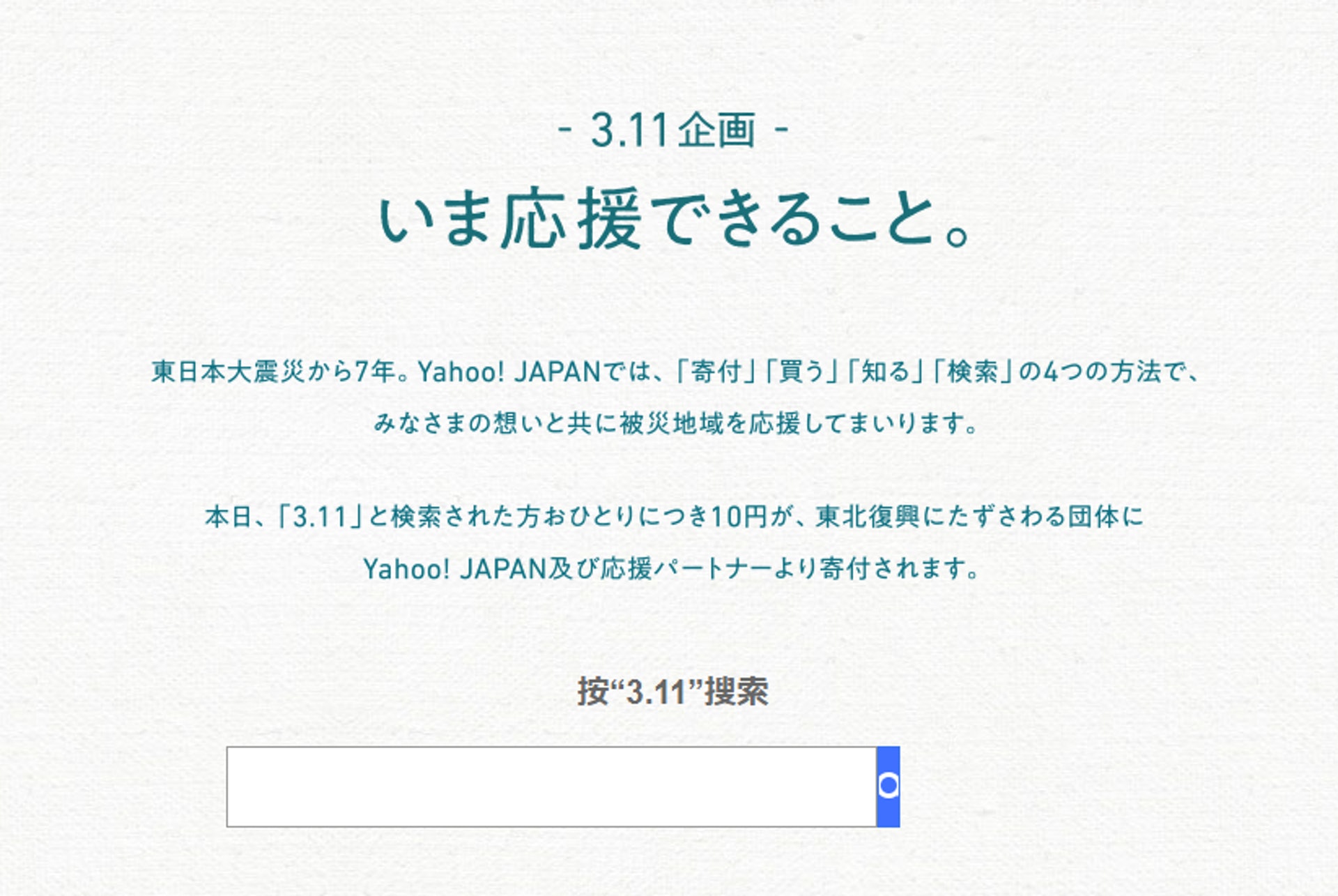 ট ইট র Digit Pepper 日本3 11大地震4年後的今日 東北地區仍在努力復興中 今天 只要以 3 11 為keyword於yahoo Japan搜索 Yahoo Japan便會向災區的志願團體捐出10円作復興用途 請即支持 Http T Co Bg7chlusfk