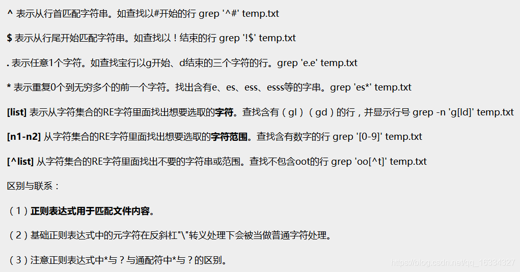 基础正则表达式(Basic regular expression) 1) ^ :例如 ^word 以word开头的内容 2)$ :例如 word$ 以word结尾的内容 3)^$ :空行 4) :表示且只能代表任意一个字符(当前目录,加载文件) 5)\ :转移字符,让有着特殊身份的字符,变回原来的字符。. V :显示没有被模式匹配到的行 o:只显示被模式匹配到的字符串。 三、正则表达式 正则表达式,又称规则表达式。(Regular Expression,在代码中常简写为regex、regexp或RE)。正则表达式通常被用来检索、替换那些符合某个(规则)的文本。. 正则表达式是一种字符模式,用于在查找过程中匹配制定的字符。 元字符通常在Linux中分为两类: Shell元字符,由Linux Shell进行解析; 正则表达式元字符,由vi/grep/sed/awk等文本处理工具进行解析; 正则表达式一般以文本行进行处理,在进行下面实例之前.