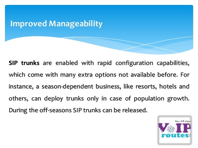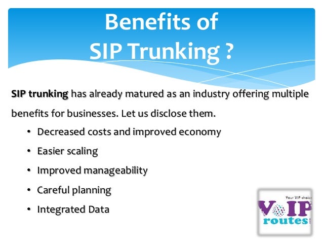 It’s no wonder that SIP trunking is so popular with businesses It helps them save up to 60% of their communications costs, increases flexibility, and opens up a host of unified communications features Reselling SIP services is an exceptional opportunity to make more money and delight your customers at the same time. A short 2 minute visual guide explaining SIP Trunking and its business benefits Solution IP are experts in VoIP, Hosted Telephony and SIP Trunking, includin. Menu Dictionary a SIP trunk is assigned by a SIP provider to a customer, and a single trunk supports one or more telephone numbers (see SIP trunking).