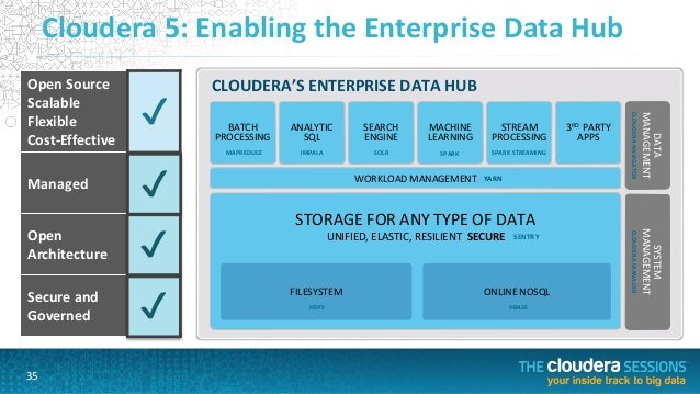 Hadoop’s costeffective scalability allows for more analytic exploration of data that previously was too costly to store or troublesome to format Integration of Cloudera and SAS technologies makes big data analytics approachable and supports innovative applications. CDH delivers everything you need for enterprise use right out of the box By integrating Hadoop with more than a dozen other critical open source projects, Cloudera has created a functionally advanced system that helps you perform endtoend Big Data workflows. Cloudera is a company that specializes in mega data collections built around the Apache Hadoop platform to create what it calls “enterprise data hubs” Such hubs enable customers to create informationdriven organizations, where Cloudera provides a platform for enterpriseready data management.