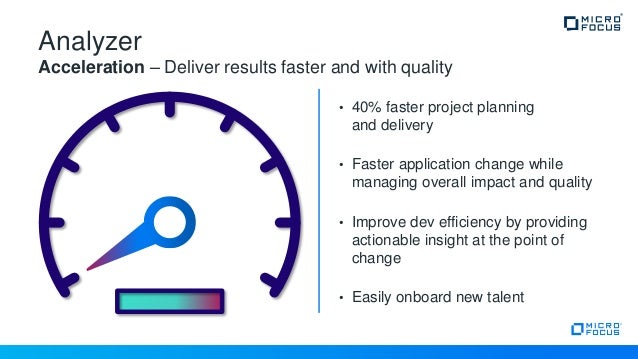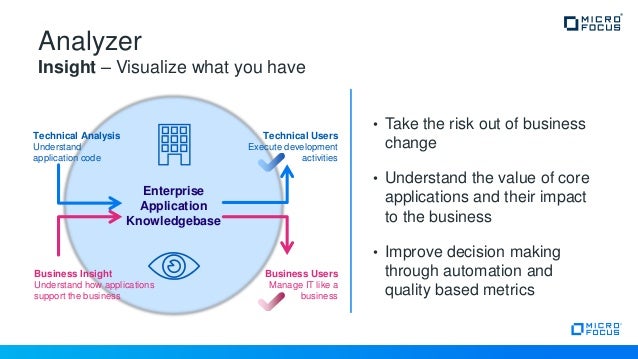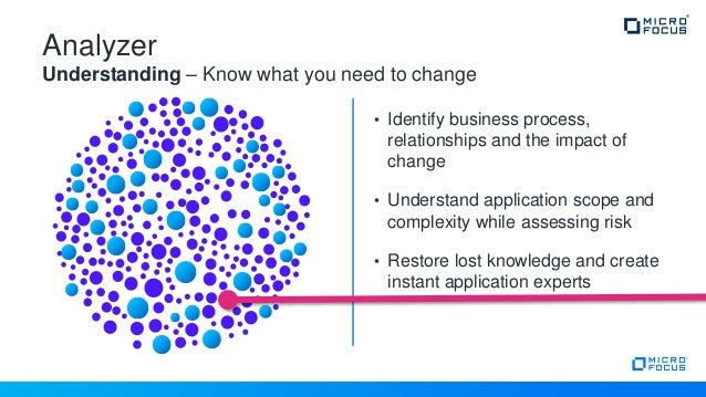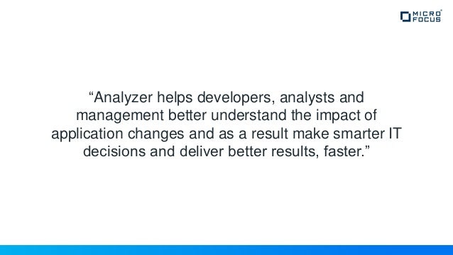 Micro Focus Enterprise Analyzer delivers a wide array of tools and content to support better application understanding Improve team effectiveness Ease of use enables even new joiners to become instant experts, increasing effectiveness and confidence when making code changes. COBOL Analyzer Automatically understand and analyze Micro Focus COBOL applications Agile & DevOps Build COBOL applications using Agile and DevOps practices Linux, Cloud & Containers Deploy COBOL applications across distributed, containerized or cloud platforms Application Rehosting. COBOL Analyzer Automatically understand and analyze Micro Focus COBOL applications Agile & DevOps Build COBOL applications using Agile and DevOps practices Linux, Cloud & Containers Deploy COBOL applications across distributed, containerized or cloud platforms Application Rehosting.