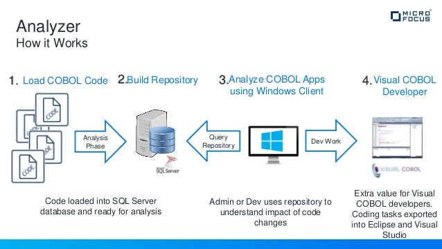 COBOL Analyzer Automatically understand and analyze Micro Focus COBOL applications Agile & DevOps Build COBOL applications using Agile and DevOps practices Linux, Cloud & Containers Deploy COBOL applications across distributed, containerized or cloud platforms Application Rehosting. COBOL Analyzer Micro Focus Comprehensive analysis and intelligence solutions designed for nonmainframe COBOL applications Get it now Product Description Learn More Complete support for Micro Focus COBOL applications on distributed platforms;. COBOL Analyzer Automatically understand and analyze Micro Focus COBOL applications Agile & DevOps Build COBOL applications using Agile and DevOps practices Linux, Cloud & Containers Deploy COBOL applications across distributed, containerized or cloud platforms Application Rehosting.
