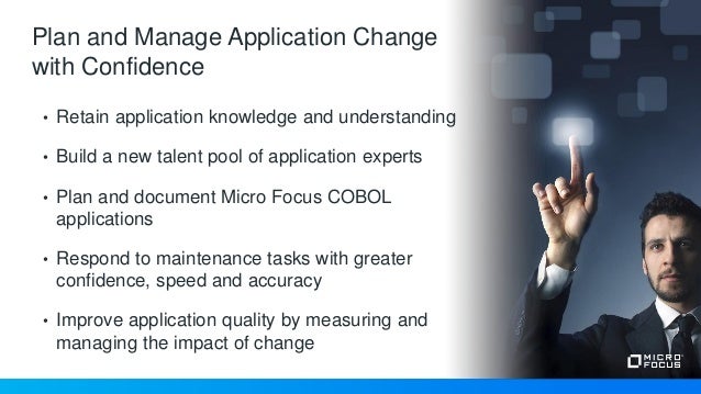 COBOL Analyzer Automatically understand and analyze Micro Focus COBOL applications Agile & DevOps Build COBOL applications using Agile and DevOps practices Linux, Cloud & Containers Deploy COBOL applications across distributed, containerized or cloud platforms Application Rehosting. COBOL Analyzer Automatically understand and analyze Micro Focus COBOL applications Agile & DevOps Build COBOL applications using Agile and DevOps practices Linux, Cloud & Containers Deploy COBOL applications across distributed, containerized or cloud platforms Application Rehosting. This is driving the appetite for modern tooling to help transform core COBOL systems Micro Focus thinks change and growth is the norm Micro Focus continues to make the COBOL applications accessible on newer platforms – customers are moving some of their apps to public cloud, but a lot of their businesscritical apps are remaining onpremise.