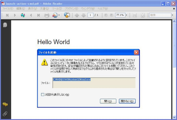 Acrobat および Adobe Acrobat Reader は、疑わしい状態にあるコンテンツまたはアクションを引き続きブロックします。警告を非表示にするには、「閉じる」 ボタンまたは「キャンセル」をクリックします。.