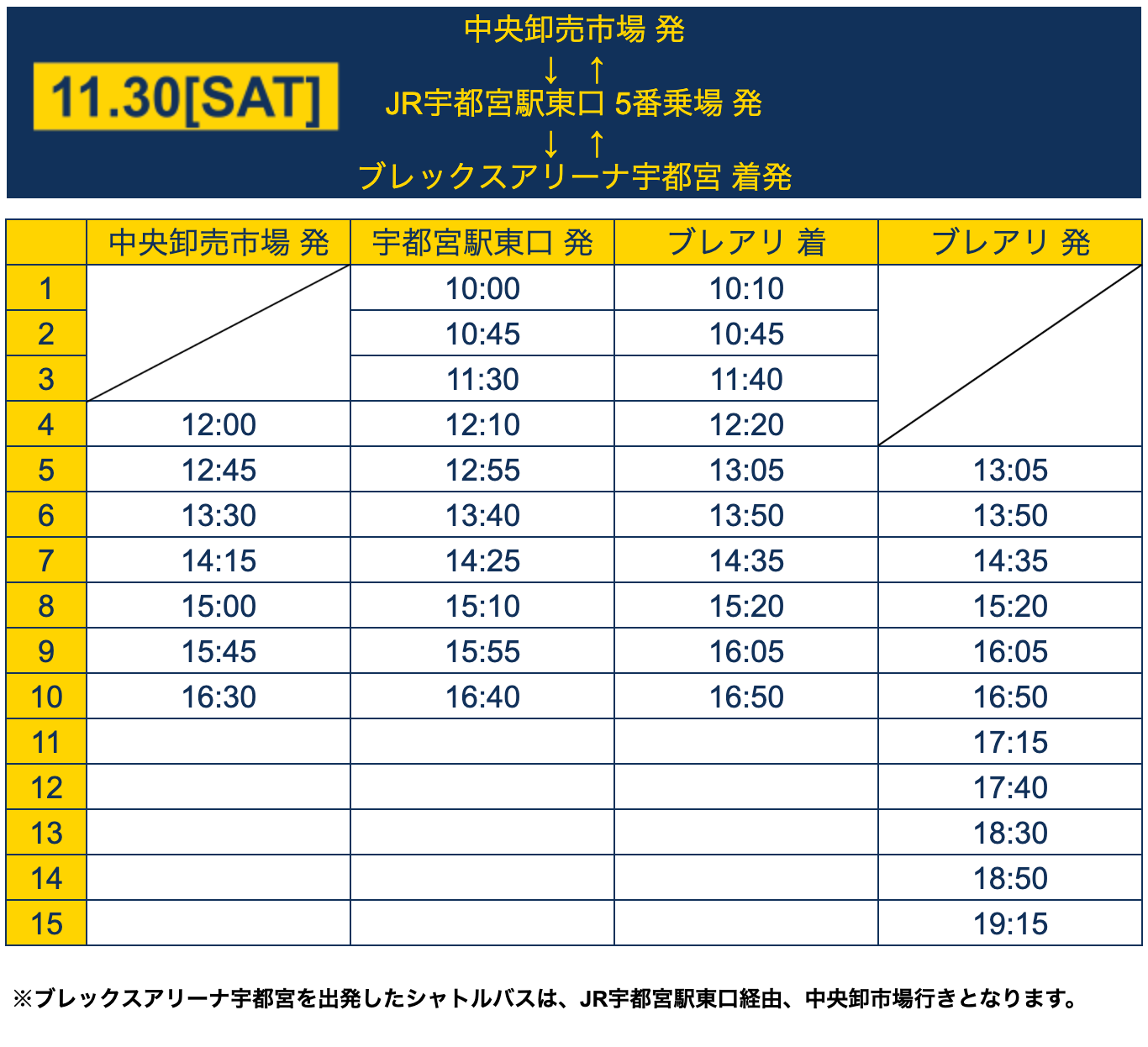 宇都宮ブレックス V Twitter 無料シャトルバスのご案内 11 4 土 5 日 Vs 千葉ジェッツ ブレアリ 敷地内の駐車場はご利用いただけません 周辺の有料駐車場は数に限りがございますので 臨時バスをご利用いただくか 公共交通機関のご利用をお願いします T