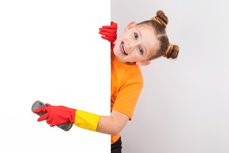 白地では 分離された愛らしい赤い髪の少女オレンジ T シャツと赤いラテックス手袋でそばかすが彼女の手で緑のブラシを押し 顔を作るします Copyspace の写真素材 画像素材 Image