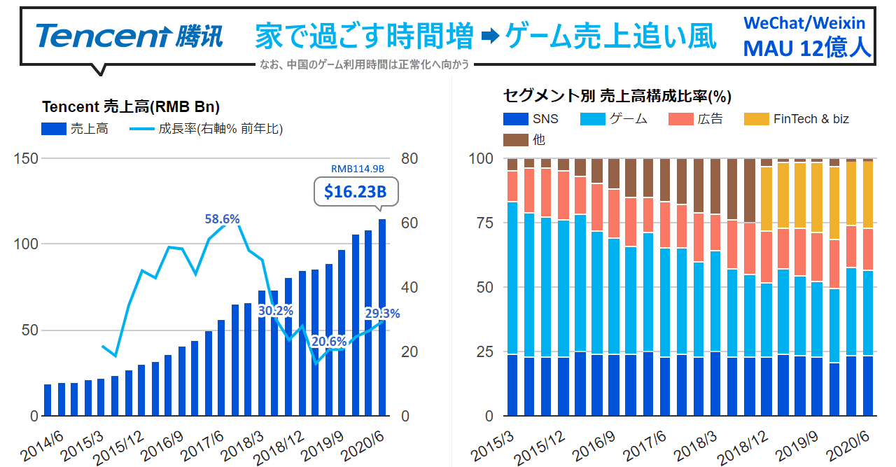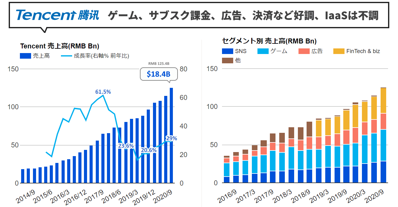NYSE(ニューヨーク証券取引所)とNASDAQに上場してい stocksfinanceyahoocojp 上記サイトによると、なんと売上が「8兆円」を越えています〜 テンセントはどうだったんでしょうか? テンセント19年第4Q、売. テンセントコロナでゲーム事業が好調 テンセントの収益と成長率推移(億元) (決算資料に基づきチャイトピ作成) コロナの影響でテンセントのq1業績が好調。収益は1080億元(約1兆6300億円)で前年比26%増加した。. テンセント (Tencent)とは 直近の決算 ( 更新) 直近の株価 ( 更新).